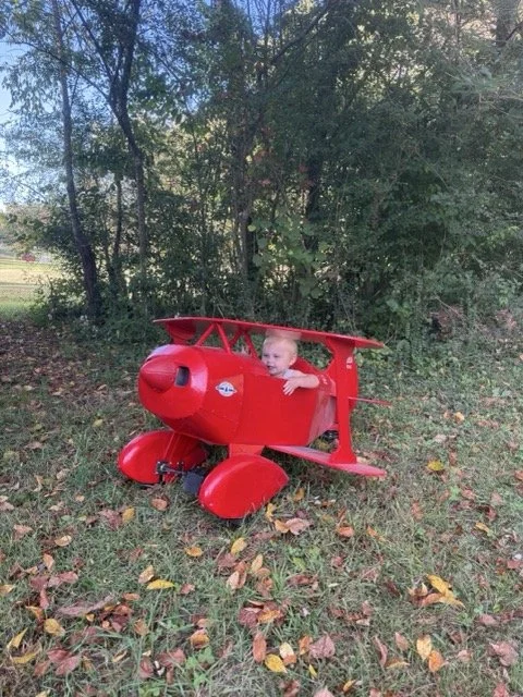 A handmade, toddler-sized red airplane set in front of lush greenery. This set is ideal for children’s sessions, “Santa’s little pilot” themes, or those who want something playful and unexpected. Parents will love how this setup stands out from the typical mall-Santa look.